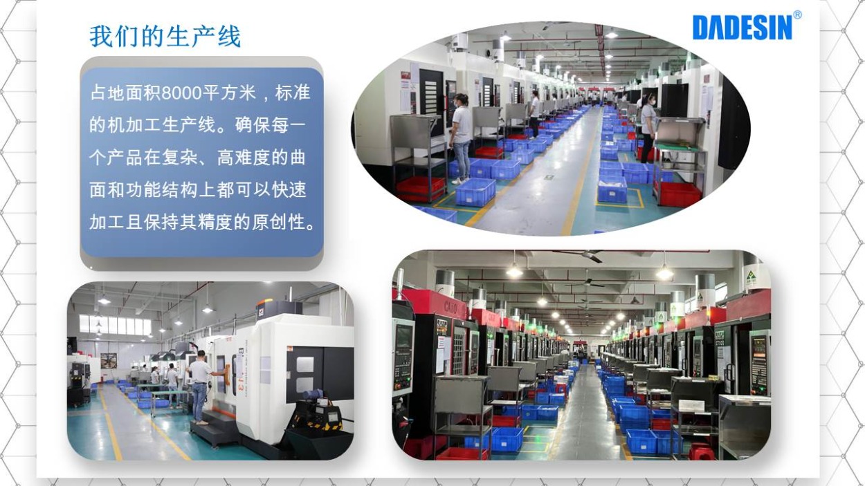 大德兴精密创于2006年,是一家集加工设计、CNC生产制造、五金零件加工、喷涂喷漆、阳极氧化、组装和服务为一体的高精密生产制造厂家,公司占地总面积达8000平方米,现有员工100余人,其中专业技术人员80余人,设备配套齐全,所做产品从原材料到成品均可完成一站式生产。我们拥有德国格劳博(GROB)、瑞士米克朗(+GF)、国产北京精雕、美国哈斯(HAAS)
