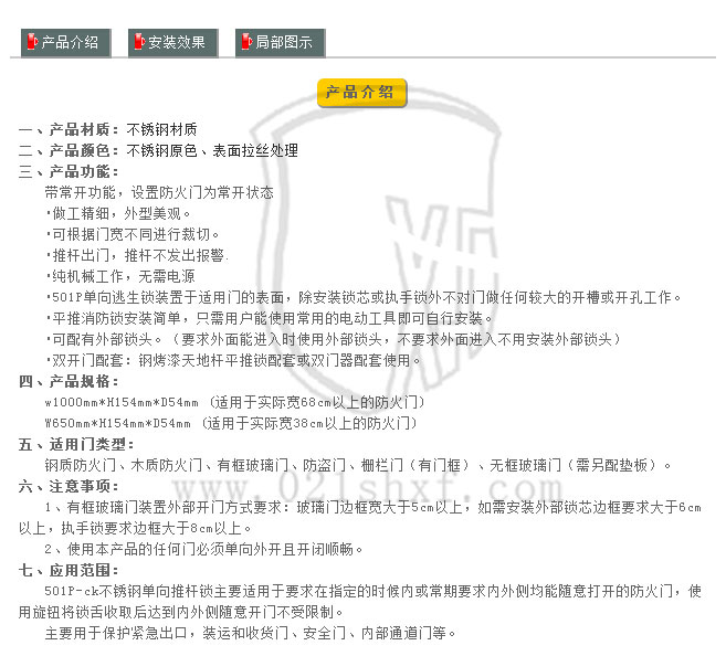 >适用门类型:钢质防火门、木质防火门、有框玻璃门、无框玻璃门(有框玻璃门及无框玻璃门需高现场情况增加金属垫板或有机玻璃板),以上各类型的门必须要求单向外开。