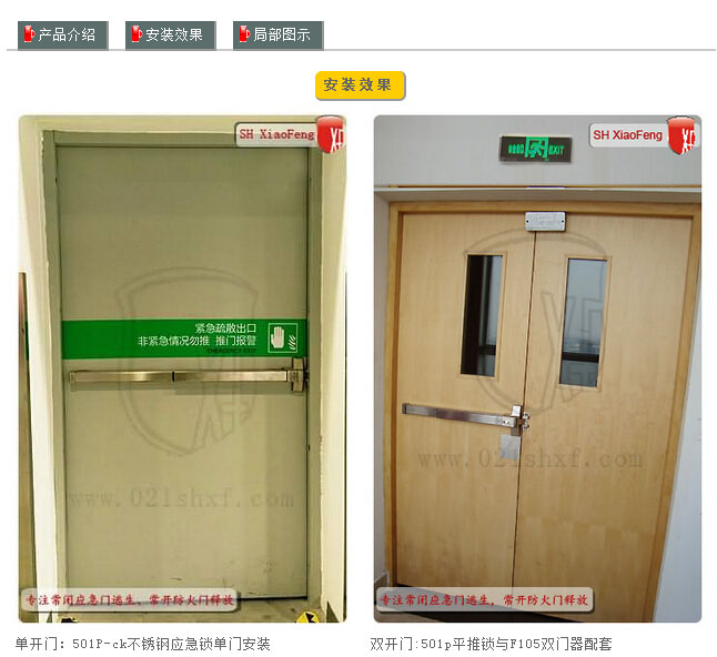 此系列产品单开门以安全平推门锁为主,双开门由平推消防门锁及防火门专用双门器或消防推杠锁及(天地杆锁)连杆式平推锁组成,适用于常闭且需要经常通行的安全通道,主要功能为无障碍推杆应急逃生。可按用户需求配置外部执手锁(可设置常开常闭)或锁芯。内部推杆开门、外侧钥匙开门。