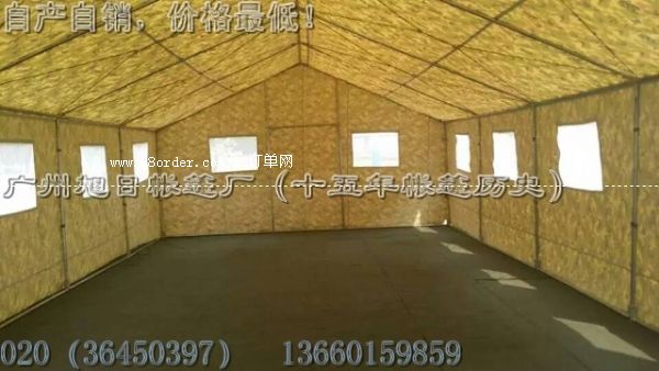 军用帐篷为框架式帐篷,军用帐篷的顶部:为2*2 环保无气味的三防帆布(军绿色) 厚度在43丝、具有防雨、耐高温、防阻燃 、防断裂。每平方克重750克