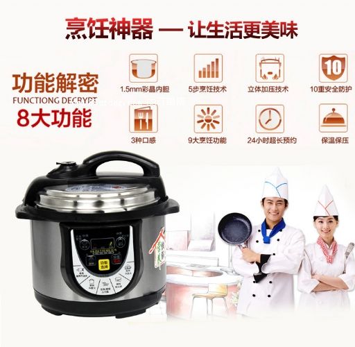 电饭锅为5l大容量,数码显示,內胆配置双喷不粘铝胆