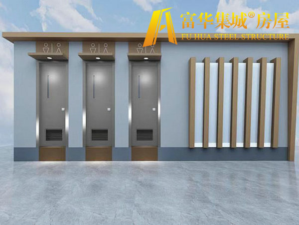 富华集城品牌环保厕所房体根据型号不同,适用包括彩钢复合板、优质铝塑板、进口金属雕花板、氟碳喷涂钢板、优质陶瓷墙砖、泡沫保温板等各种新型优质建筑材料。这些材料的特点是:重量轻,便于移动、隔音、隔热、占地面积小、朴实大方整洁、集成化高、颜色多样。