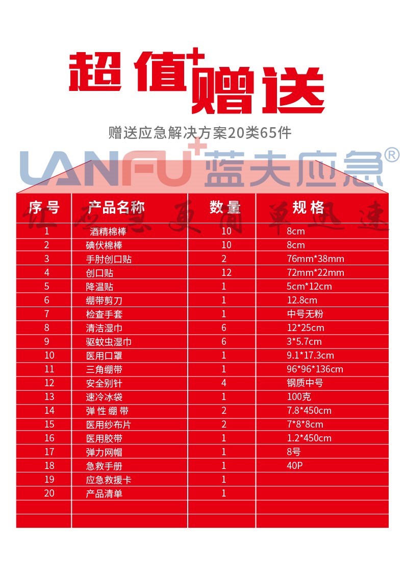 主要功能:消毒清创、伤口包扎、防护隔离、冷敷降温等以及其他应急器具。