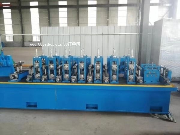 以带钢为原料,经开卷、成型、高频焊接、解决焊瘤、定径、校直、切断等一系列制管工序制造出圆钢管或各样式一行钢管的成套设备。采用辊式成型将带钢冷弯加工成圆坯,通过高频感应加热将焊缝挤压形成圆管,在经过定径加工生产出各样式标准规格的圆管、方矩形管。