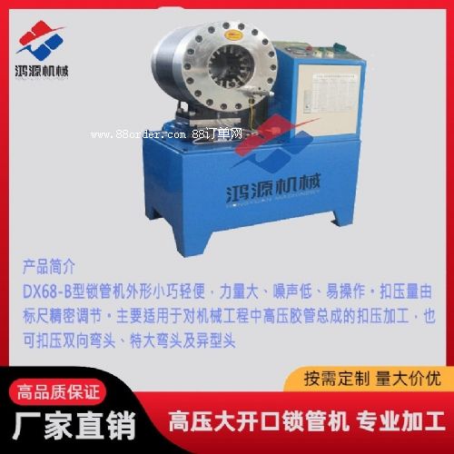 dx68-b型锁管机外形小巧轻便,力量大、噪声低、易操作。扣压量由标尺精密调节。主要适用于对机械工程中高压胶管总成的扣压加工,也可扣压双向弯头、大弯头及异型头。