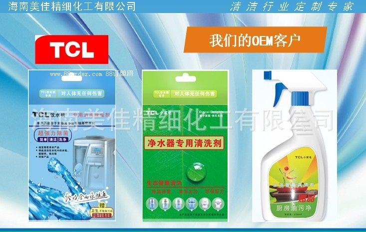 目前已和国内上百家知名家电企业合作,包括美的、tcl、苏泊尔、奥克斯、格力、海尔、皇明、安吉尔、科龙、奔腾、老板、国美、苏宁、永乐等产品线有:饮水机消毒剂;饮水机除垢剂;汽车水箱除垢剂;油烟机清洗剂;洗衣机槽清洗剂;不锈钢清洁粉;太阳能除垢剂;冰箱消毒剂;空调清洗剂;地暖除垢剂 锅炉除垢剂等;就目前家电清洗剂国内空白无竞争,尚待规范的情况下。为了进一步满足顾客的家电清洁需求,把健康带给广大市民。