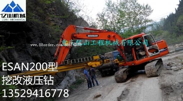 一、性能特点 5、采用公司研发的先进自动化凿岩液压系统,实现凿岩的高功效,自动防止卡钎,快进快退,高低压冲击,自动切换。 二、应用介绍及优势 挖机改造为您开启了新的施工方法。挖斗+破碎锤+切削钻机+凿岩钻机+潜孔钻机,一机多用,为您降低成本。无论您是从事采石业、采矿业、土建工程、钢铁工业、隧道工程或路桥工程,您都可以借助这灵活、耐用、噪音小且震动低的特种机器,在许多传统方法失效或成本高的地方领先同业。 外挂式液压凿岩机是以高压液压油为工作介质的强力钻岩设备,对坚硬岩、中硬岩及软岩均适用,钻孔直径从28mm-89mm,钻孔速度每分种在600mm-1200mm以上,深度可达15m,其效率及功能优于国外同类产品。 该机具有技术性能先进,结构新颖,钻速快、振动小、噪声低、耗能少、操作灵活方便、故障率低、使用寿命长、工人劳动强度低等优点。可广泛用于大理石、花岗岩、金属矿、煤矿及非金属矿的开采工作中,也可用于地质勘探坑探巷道掘进以及采石,水电,铁路,港口,基地,基建,国防工程中钻凿炮眼,还可以用于城市拆除旧建筑物实现控制爆破,其工作效率是风钻的5-10倍,能耗却只有风钻的1/3。液压凿岩机是取代风钻机的理想工具。此机留有大风量气管接口,如孔径较小,而且钻孔深度3m之内,可采用挖掘机自带3.2立方的活塞式空压机;如孔径较大,而且钻孔深度超过3m,可根据需求增大空压机配置或者采用备用气管接口外接一个10立方左右的空压机(此台空压机可购可租)来提供风量。 三、技术参数