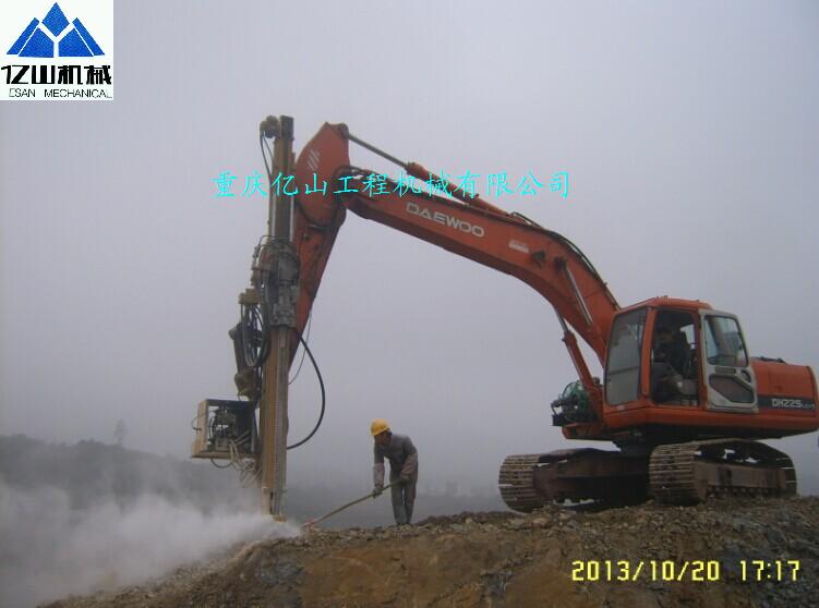 亿山外挂式液压凿岩机相比传统的凿岩设备效率显著,同比效率高出30%~60%,完全实现自动化凿岩钻孔作业。具操作简易,设计人性化,感观直接,实现挖掘机一机多用……等特性。采用法国技术基础研发制造亿山机械公司荣誉出品。 1.配载机型:20吨级以上挖掘机(挖机泵流量达200l/min, 20吨最适合,最经济) 2.重量:约1000公斤左右 3.凿岩孔径范围:28mm~89mm 4.经济钻孔深度:3-15米(注:手动接杆,凿岩速度3m/4min;12m/35min。) 5.适合岩石:坚硬砂岩.坚硬花岗岩.石灰岩.大理石.火山石等坚硬岩石(硬度f大于6级)