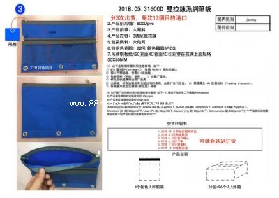 1.产品数量4个颜色100万个 2.产品前后幅:600dpvc 3.产品前袋:六网料 4.产品拉链:3號尼龍拉鍊 5.前袋网料:六角网 6.铁银色鸡眼:22号 銀色鷄眼3pcs 7.吊牌铜板纸120克面4c背面1c印刷穿在拉牌上面规格50x55mm 8.产品包装:4个色配色入胶袋24个 4包入1外箱 出厂价不含税